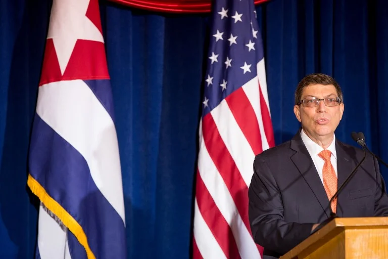 Na foto acima, o chanceler cubano Bruno Rodríguez participa da cerimônia de reabertura da embaixada de Cuba em Washington, em 20 de julho de 2015. O evento marcou um passo simbólico na retomada das relações entre os dois países, mas o fim do embargo comercial ainda depende de decisão do Congresso dos EUA.